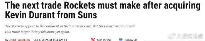 8换1拿下杜兰特后,火箭队最多还能再卖5枚首轮签!为此在字母哥仍在考察下家的情况下,美媒《clutchpoints》晒出一笔9换1交易方案,交易火箭队孤注一掷打包卖申京换字母哥。