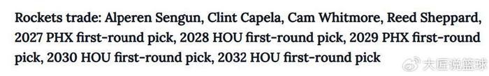雄鹿队得到:申京+白魔+谢泼德+卡佩拉+27年太阳首轮+28年火箭首轮+29年太阳首轮+30年火箭首轮+32年火箭首轮。